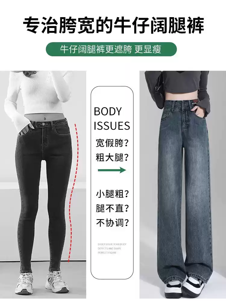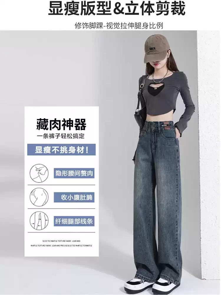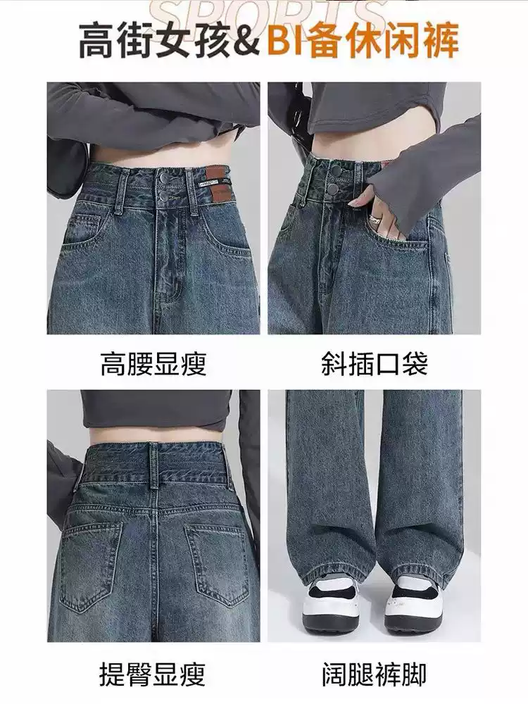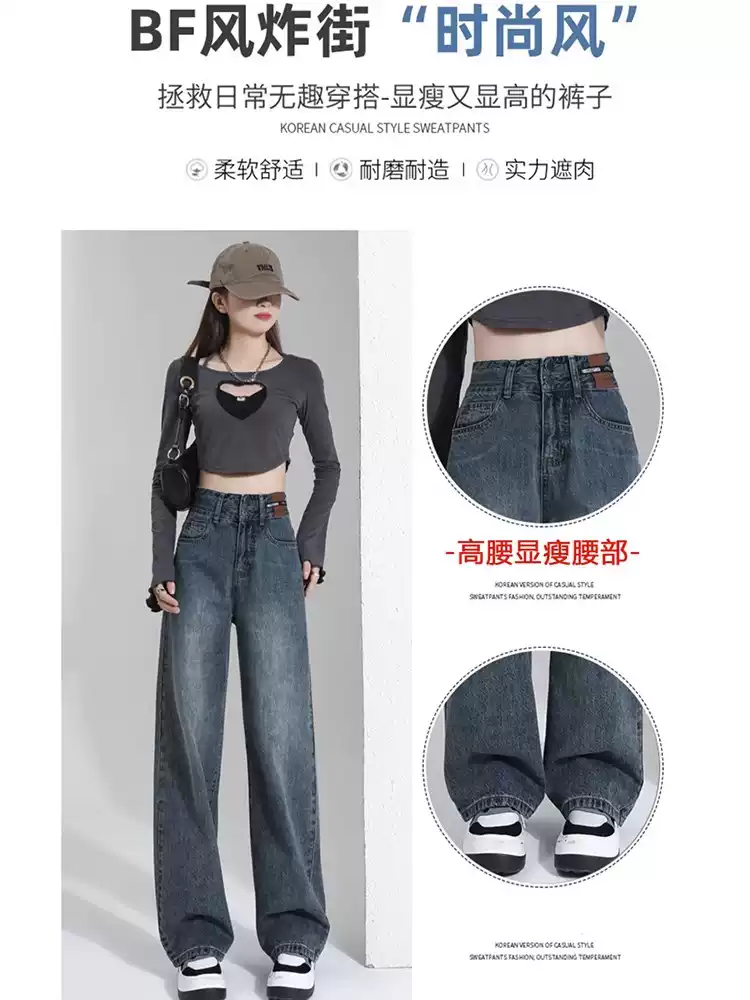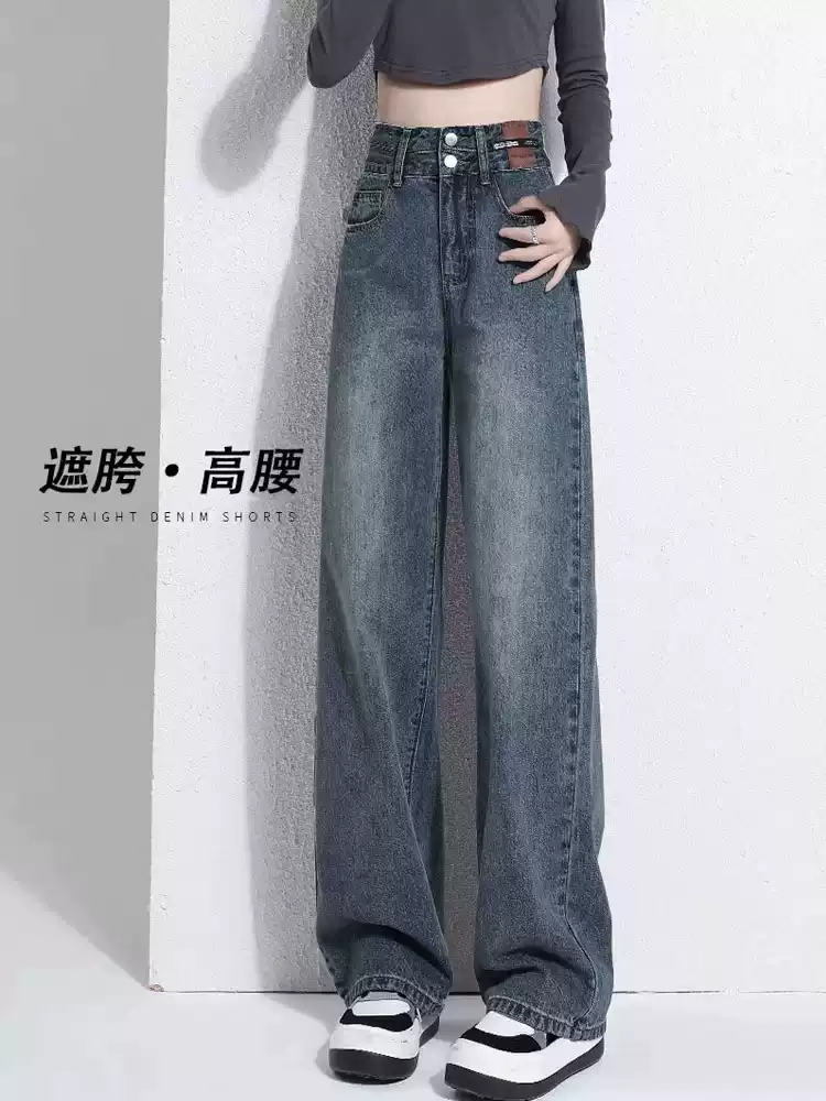 复古蓝直筒阔腿牛仔裤女秋冬加绒2025新款小个子大码高腰宽松裤子